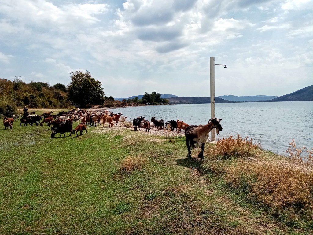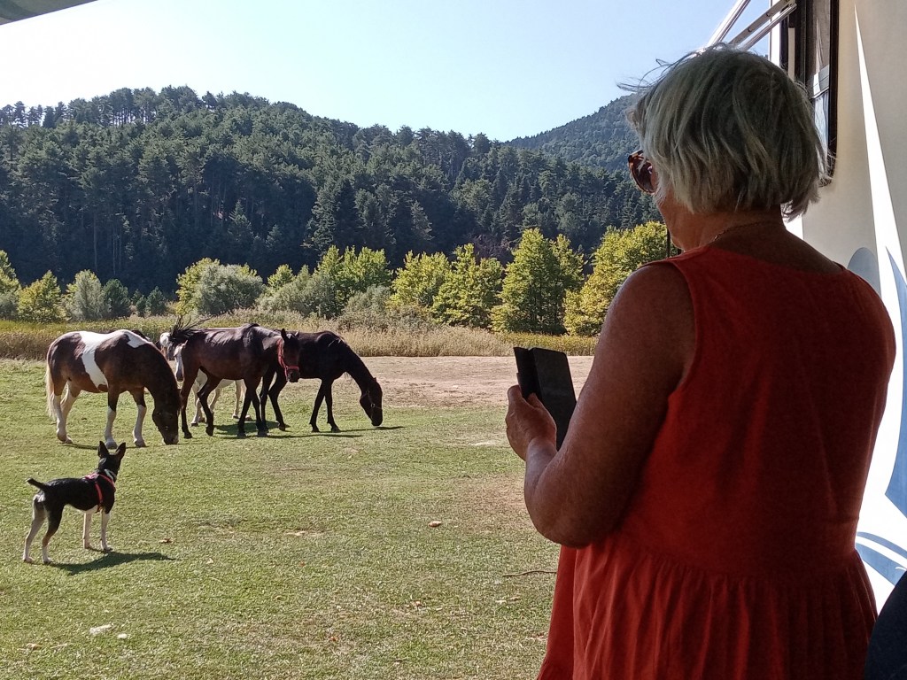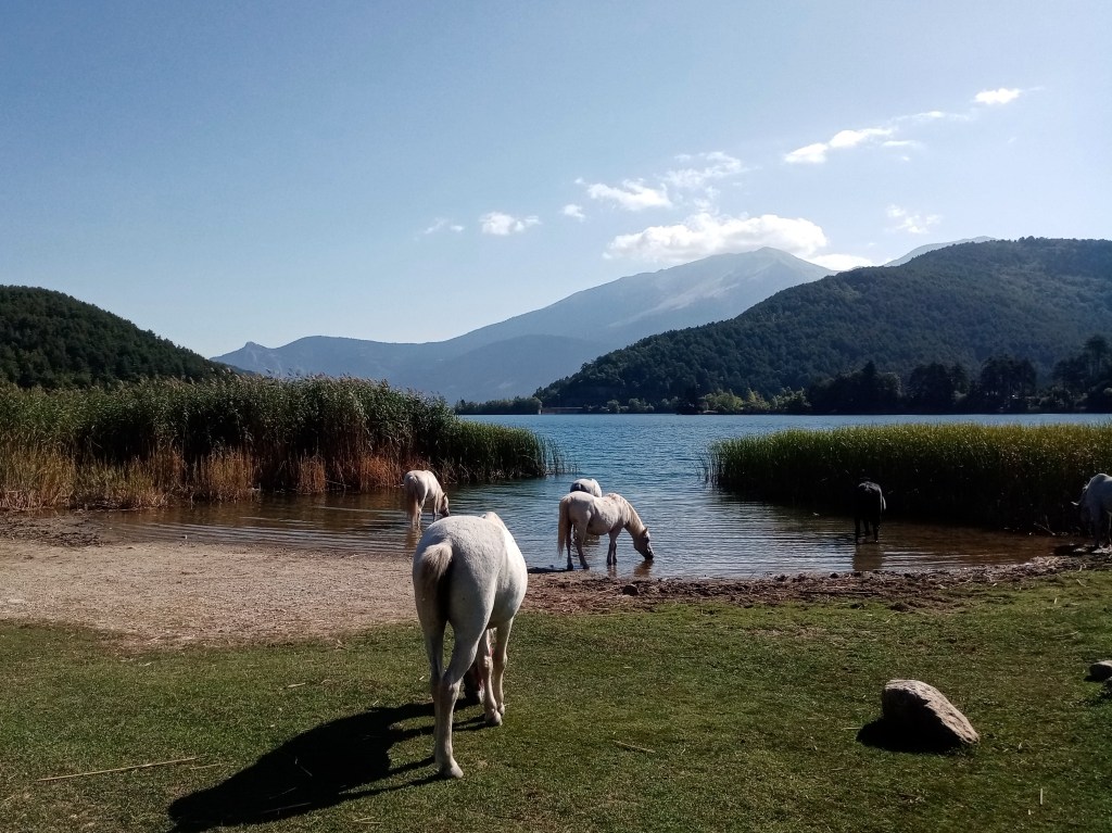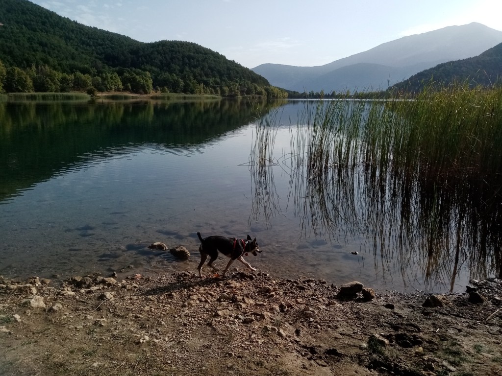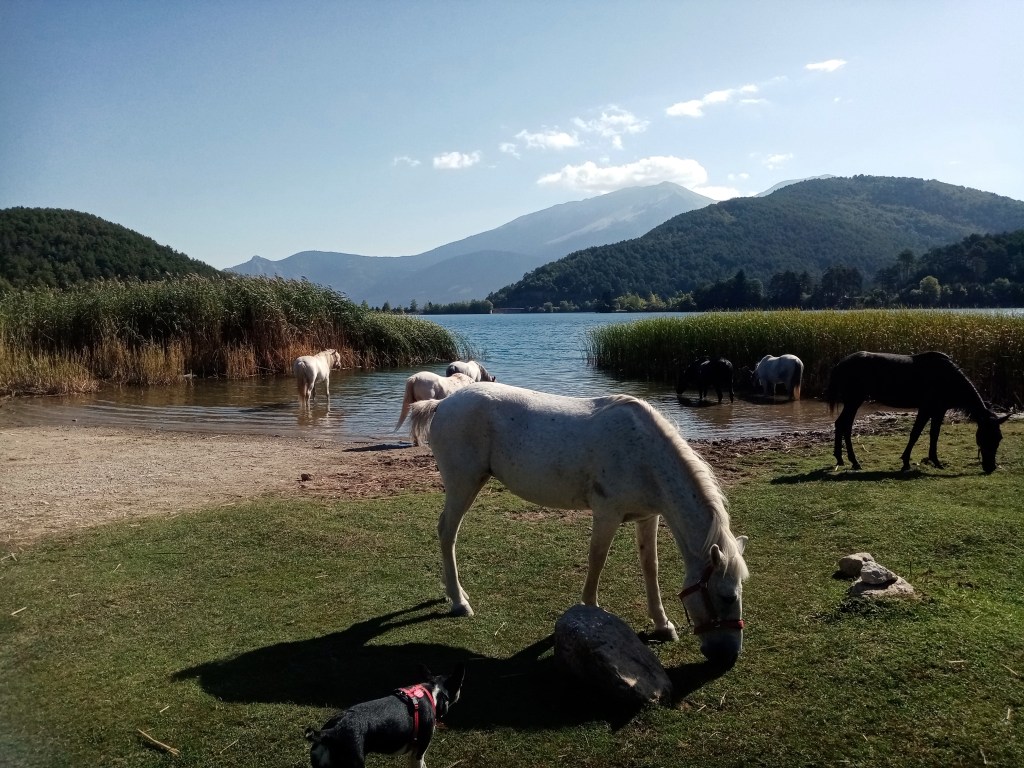 Siamo all’estremità occidentale del lago, creato artificialmente attraverso lo sbarramento di alcuni piccoli corsi d’acqua che scendono dalle alte montagne circostanti e l’intercettazione di sorgenti. Resteremo qui tutto il fine settimana, con Trilli che scorrazza avanti e indietro, anche se è ancora diffidente verso l’acqua. Unica presenza, a parte qualche raro umano che si ferma mezz’oretta e scappa, i cavalli del vicino centro ippico, che vengono ad abbeverarsi nel lago. L’aria di giorno è fresca, siamo sui 1.000 metri; la notte fa decisamente freddo, anche se non da accendere la stufa. Domenica il posto un po’ si affolla, ma lo spazio è tanto e non ci si dà fastidio; arriva il furgoncino di un agrotikò, che piazza la sua bancarella e noi ne approfittiamo per fare un po’ di spesa.