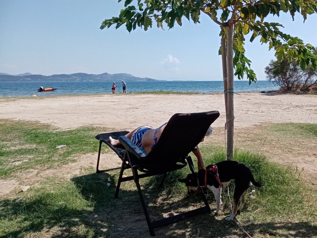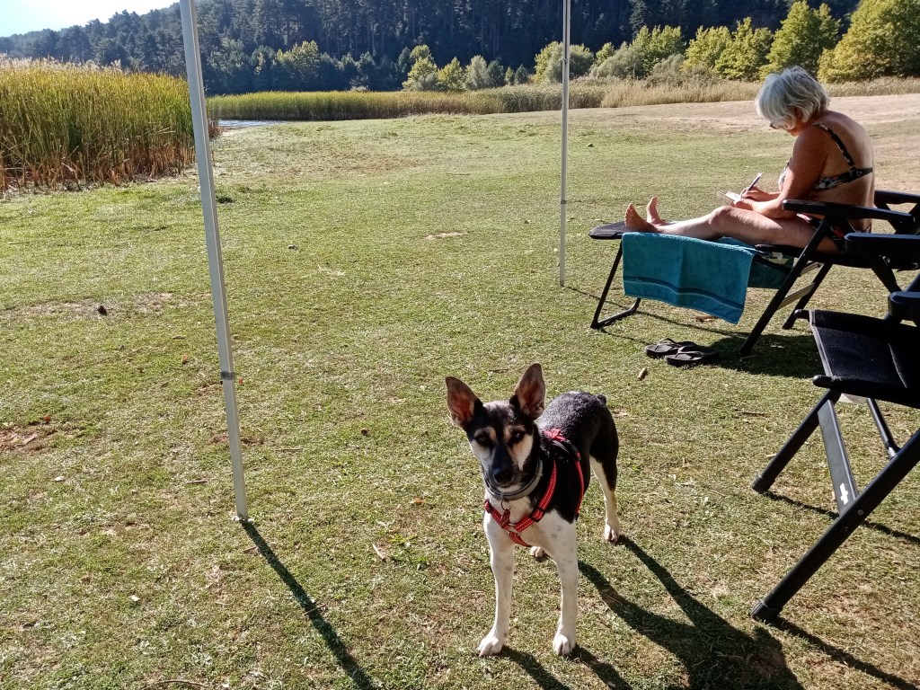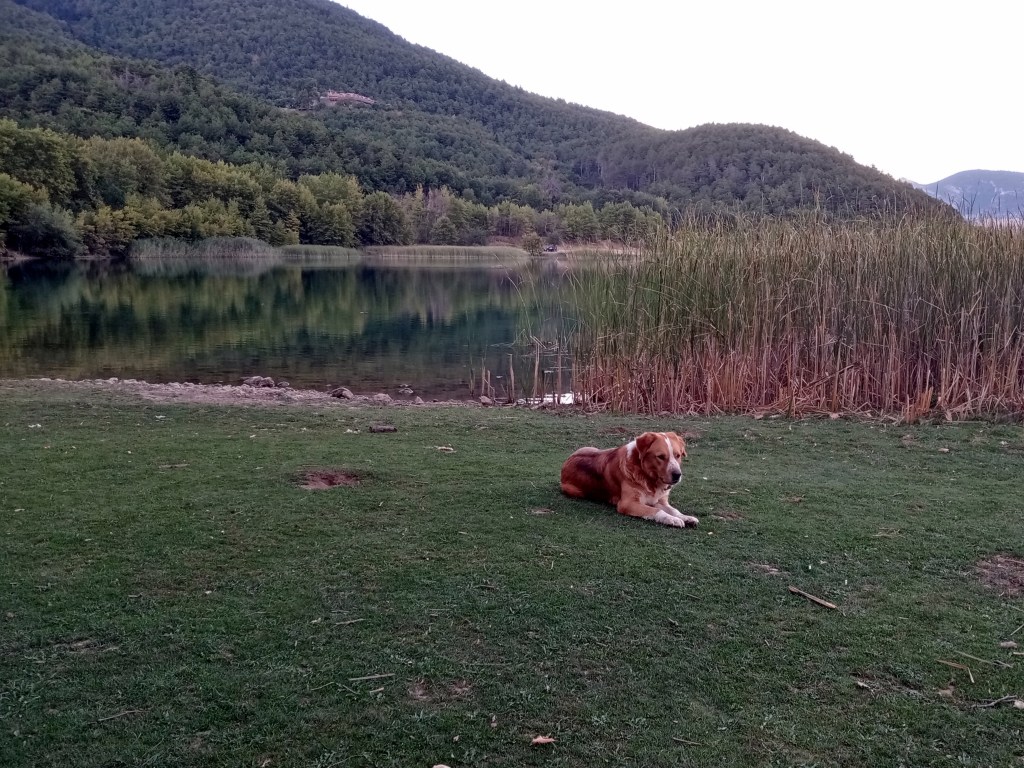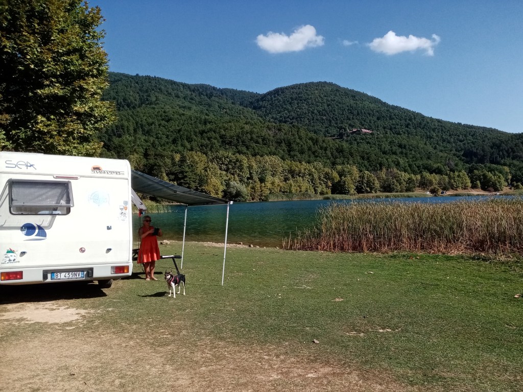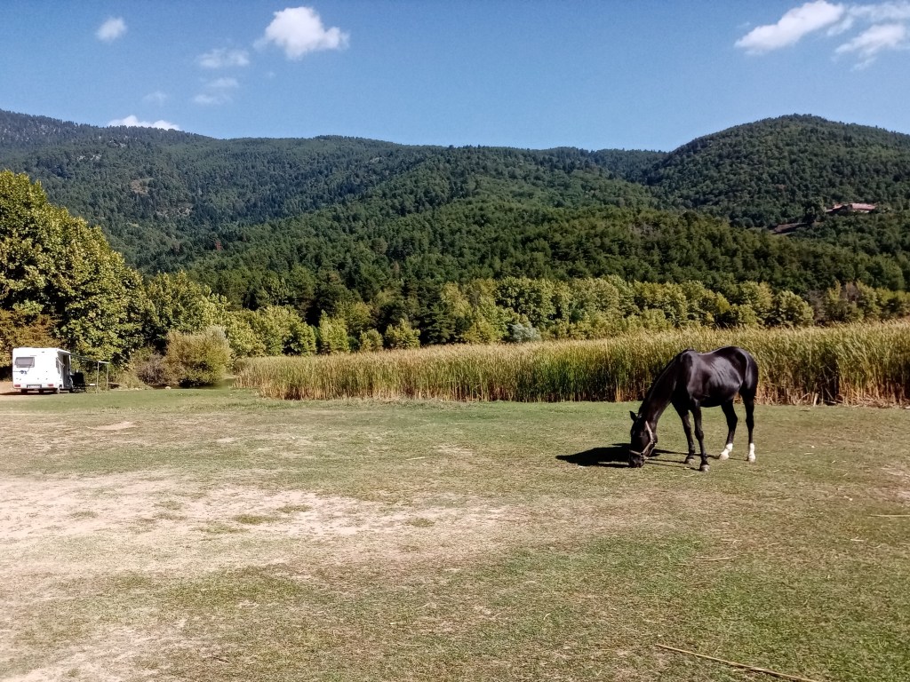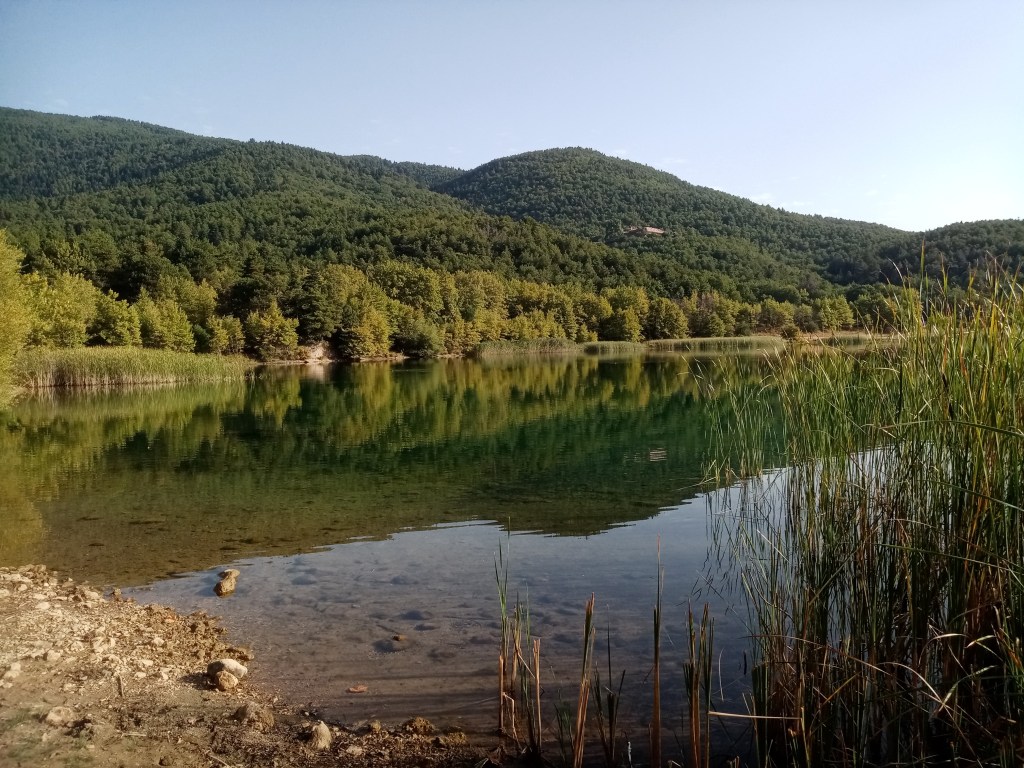 Siamo all’estremità occidentale del lago, creato artificialmente attraverso lo sbarramento di alcuni piccoli corsi d’acqua che scendono dalle alte montagne circostanti e l’intercettazione di sorgenti. Resteremo qui tutto il fine settimana, con Trilli che scorrazza avanti e indietro, anche se è ancora diffidente verso l’acqua. Unica presenza, a parte qualche raro umano che si ferma mezz’oretta e scappa, i cavalli del vicino centro ippico, che vengono ad abbeverarsi nel lago. L’aria di giorno è fresca, siamo sui 1.000 metri; la notte fa decisamente freddo, anche se non da accendere la stufa. Domenica il posto un po’ si affolla, ma lo spazio è tanto e non ci si dà fastidio; arriva il furgoncino di un agrotikò, che piazza la sua bancarella e noi ne approfittiamo per fare un po’ di spesa.