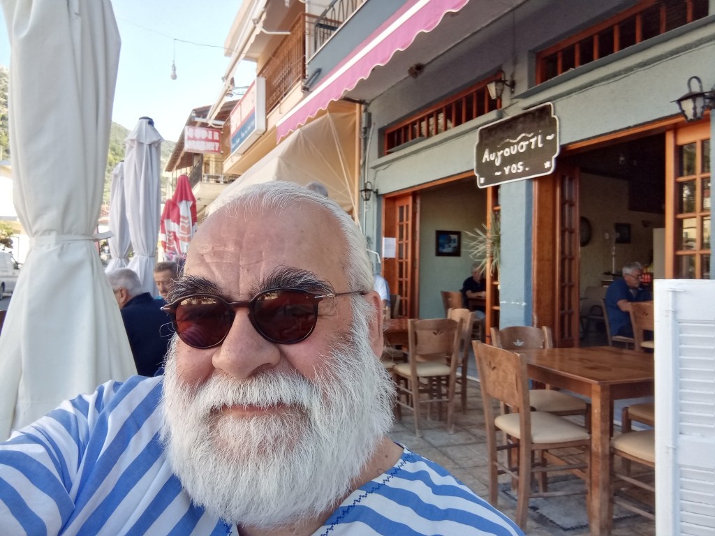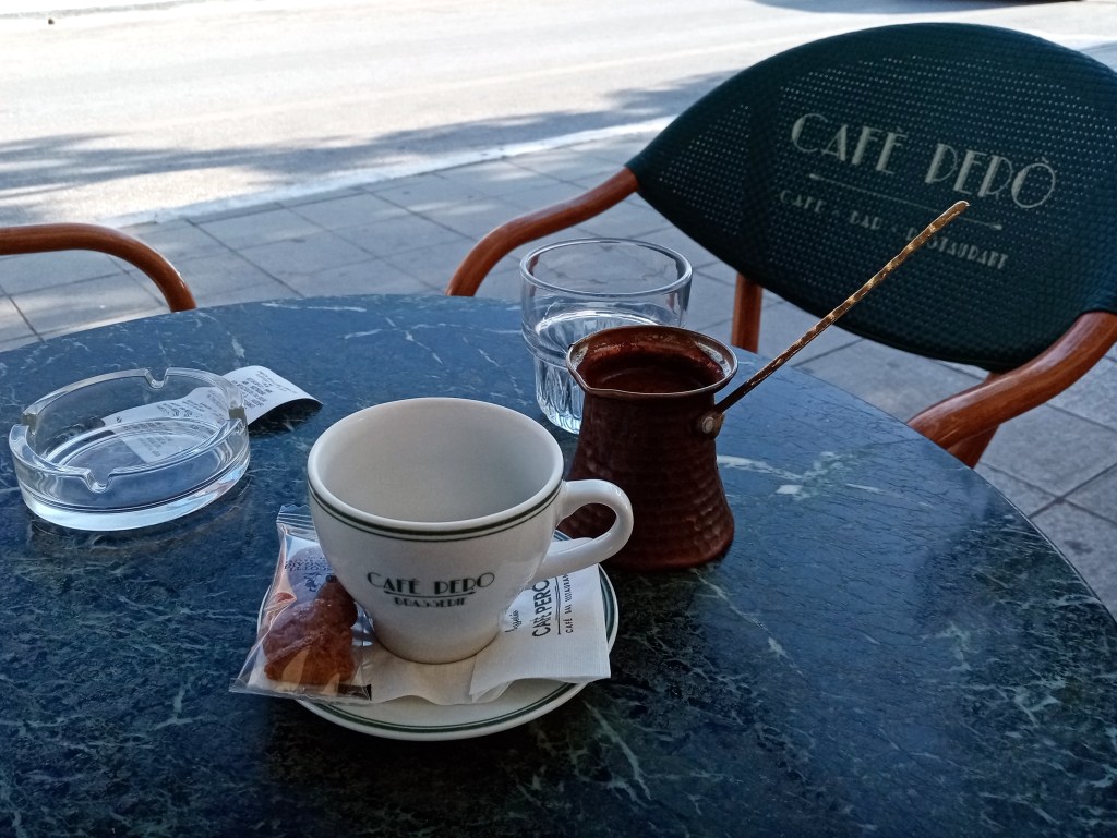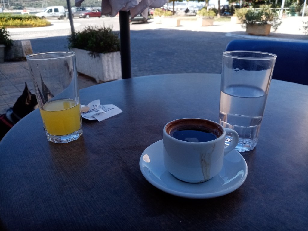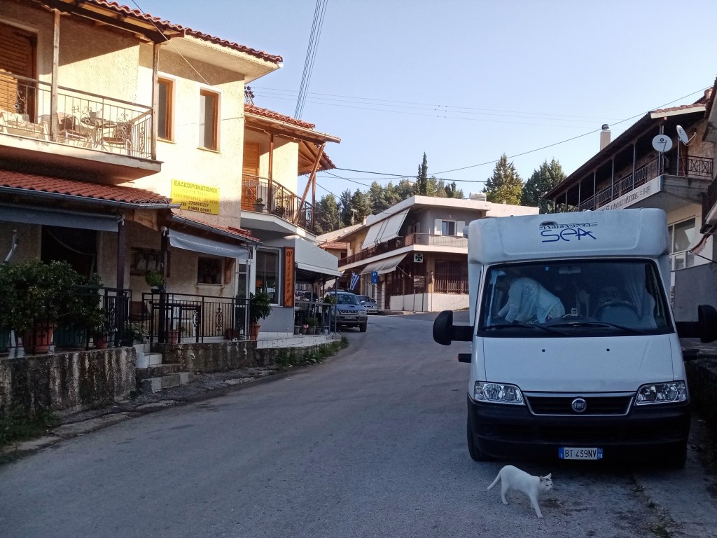21 SETTEMBRE, DOMENICA. L’ultimo giorno non inizia benissimo, il bello della vita da camperisti: “… a mezzanotte e mezza arriva un mega-camper che accende una luminaria da albero di Natale con una coppia di tedeschi che si incasina con gli allacci elettrici, poi lei si mette a pulire e a sbattere tappeti. Trilli si agita, abbaia, vomita. Santa Mirella, quanta pazienza! Tra le tante, questa proprio ci mancava, ma ne avrei fatto volentieri a meno. Si stanno organizzando in piena notte come se si dovessero accampare per un mese. E non spengono la luce.” Al mattino tutto sembra più bello, e come da copione i tedeschi stanno sbaraccando mentre noi ci organizziamo per un giretto in paese. “Ora suona la campana della domenica e mi viene in mente che in effetti è quella che mi ha svegliato alle sette e mezza, e poi mi sono girato dall’altra parte. Che buffa vacanza, fatta di tanto tempo senza cose da fare, se non leggere, scrivere – e far di conto.” E passeggiare, ultimo giorno e ultimo caffè. “Ditemi quello che volete, il mondo cambia, il progresso avanza… per me, in Grecia, il caffè è sempre e solo ellenikò skieto.”