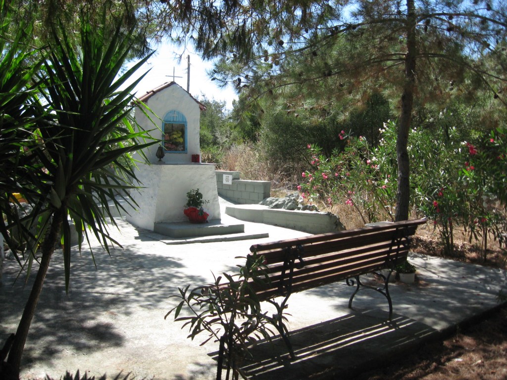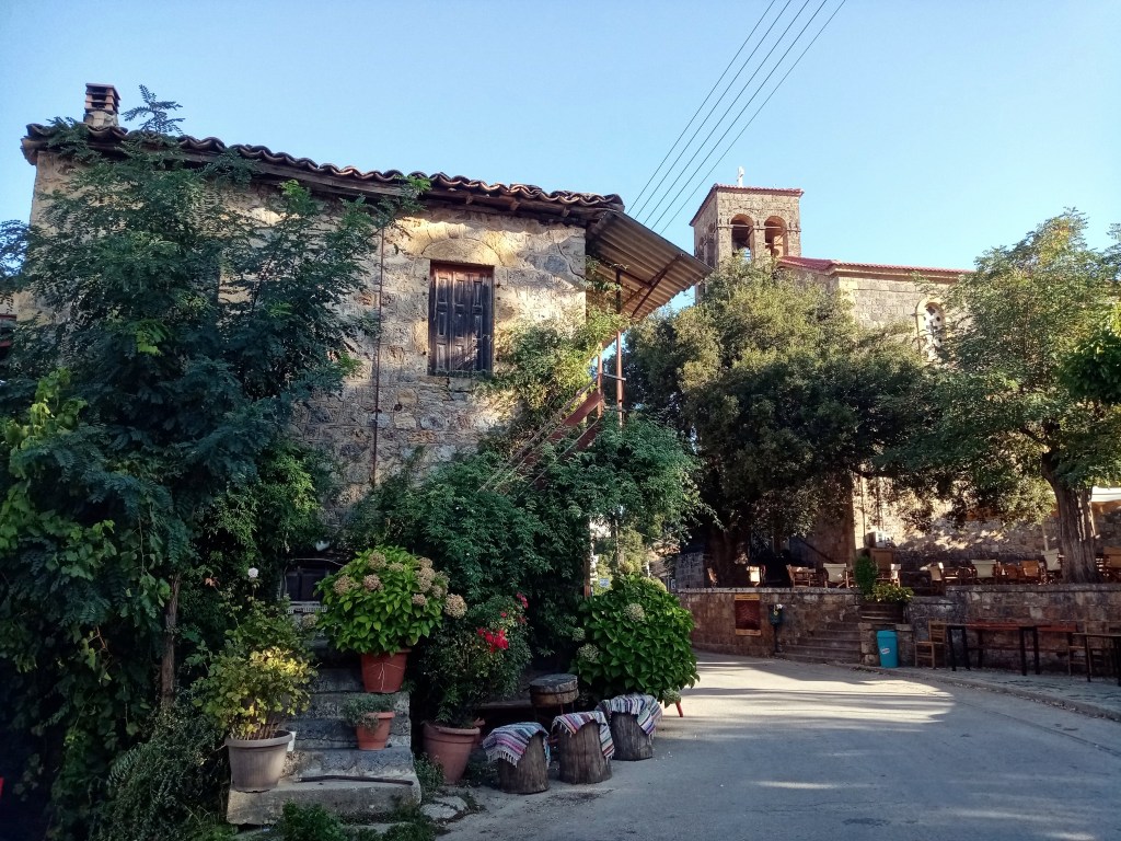 16 SETTEMBRE, MARTEDÌ. Interrompiamo il buen retiro a bordo lago per andare in missione in cerca di pane fresco e per rabboccare il carico d’acqua: qua si sta così bene che abbiamo deciso di prolungare la sosta fino a mercoledì. In fondo al lago, sei anni fa la strada svoltava bruscamente a destra passando sulla diga e completando il periplo del lago più o meno all’altezza del cimitero di Archaia Feneos. Ora invece, proseguendo diritto, una bella strada evidentemente terminata da pochi mesi ci indirizza verso Feneos, che le guide dicono descrivono come una delle più importanti città dell’Arcadia, nei tempi antichi. Immaginando che si tratti del capoluogo, decidiamo di seguirla, ma arrivati in paese, dopo circa 4 km, non vediamo traccia di negozi (scoprirò più tardi che ha meno di 50 residenti). Niente paura: in tutta evidenza, la strada andrà a ricongiungersi con la statale per Kiato, che percorre il versante sud della valle. Infatti, dopo un altro paio di km, incrociamo la strada principale e, svoltando a destra, superando lo strettissimo ponte sul fiume Olvios, ci dirigiamo verso Stenò e poi a Goura, dove a mia memoria qualche bottega c’era. In effetti, il villaggio è certamente più animato degli altri che abbiamo sfiorato in questa zona, con una piccola centrale della polizia, due o tre bar, forno, supermarket, macelleria, il locale ginnasio, la classica bella piazza alberata intorno alla chiesa. Il nome del villaggio richiama un termine di un antico dialetto che significa “duro come sasso”, ed infatti la leggenda vuole che proprio qui siano nate le prime bande che a inizio ottocento diedero del filo da torcere agli ottomani, guidate dai fratelli Nikos e Giorgios Ekonomou Gouras; la storia più recente ci racconta che qui fu molto aspra la battaglia durante la guerra civile 1945-1947. E così abbiamo aggiunto un altro tassello alla lunga lista di luoghi significativi per la storia ellenica.