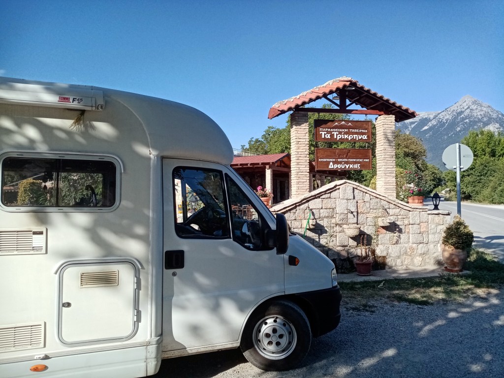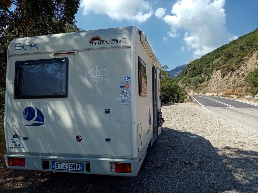 Vita da camperista. Da qui in avanti, seguendo la Statale 111, raggiungiamo il bivio per Kalavrita e finalmente ritroviamo nella segnaletica stradale nomi già fissati nella memoria. Raggiungiamo Likouria mentre annotta, da qui tornante dietro tornante la provinciale – molto panoramica – scala verso un passo senza nome a circa 1.400 m di altitudine. Ci lasciamo alle spalle la chiesetta dedicata al Profeta Elia, ed e ormai notte fonda quando affrontiamo la ripida discesa per le quattro case e le fattorie di Louzi, dove inizia la vasta piana di Feneos, nota per l’abbondanza d’acqua e ricca di campi coltivati. Ricordavo benissimo il bivio a gomito verso Archaia Feneos, e riprendiamo a salire con stretti tornanti che costeggiano il villaggio completamente buio. Ci siamo quasi. Superato il minuscolo cimitero, unico punto illuminato negli ultimi due km, al primo bivio prendiamo a sinistra: altro errore di rotta, ma me ne accorgo subito e facciamo dietro front manovrando nel cortile di una villetta. Il bivio che avremmo dovuto prendere era invece cento metri più avanti, ultimo km e parcheggiamo davanti alla chiesetta di Agios Fanourios. Sono solo le otto e mezza di sera, abbiamo sulle spalle quattro ore di viaggio per 191 km, di cui 100 in autostrada e 40 spesi a vanvera. Ma siamo davvero felici di non esserci arresi per strada cambiando meta, e stasera essere qui. Dal mio diario: “Oggi è stata giornata molto impegnativa – stancante ma anche bella. In piedi dalle 7:30, sempre in ballo, tra fare cose di partenza, viaggiare, visita scavi, visita museo, pranzo, rientro Kalamàta, saluti, viaggio, ricerca market, viaggio, scende la notte, sosta, cena veloce, lotta con calabrone. Buonanotte. A domani.”
