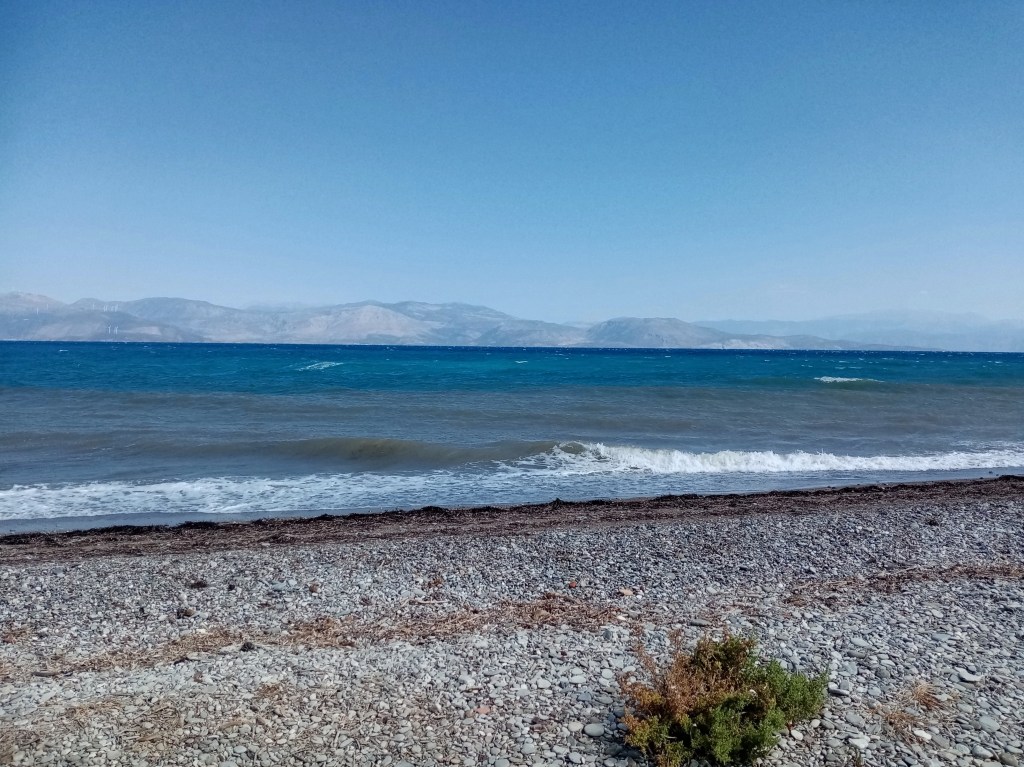 18 SETTEMBRE, GIOVEDÌ. Dormito bene nonostante il caldo, stanotte abbiamo archiviato la trapunta che è stata molto utile nelle sei notti precedenti. Lavati e ristorati, si parte con molta calma verso Diakoftò paralia nord. Dal mio diario: “Molto vento, mare grosso; hanno sistemato il pezzo sterrato sulla curva. A prima vista, una mareggiata deve aver mangiato un paio di metri di riva, ma lo spazio c’è, e la solita doccia funziona. Non c’è nessuno.” Parcheggiamo il Dinghy al solito posto, ma senza aprire il tendalino, un po’ perché c’è vento, un po’ perché la temperatura è assolutamente sopportabile, un po’ per stare in regola con le nuove prescrizioni per la sosta libera. Nel pomeriggio il vento rallenta, il mare si calma, ed è fantastico ritrovarsi nella musica del mare mentre cala il sole.