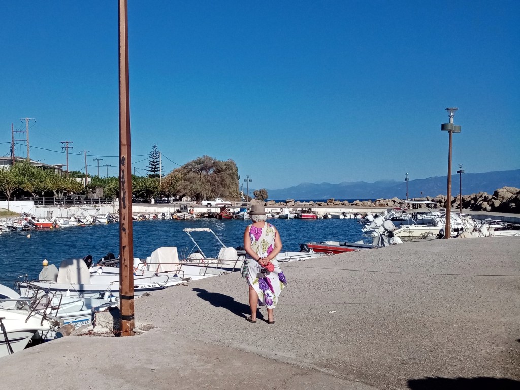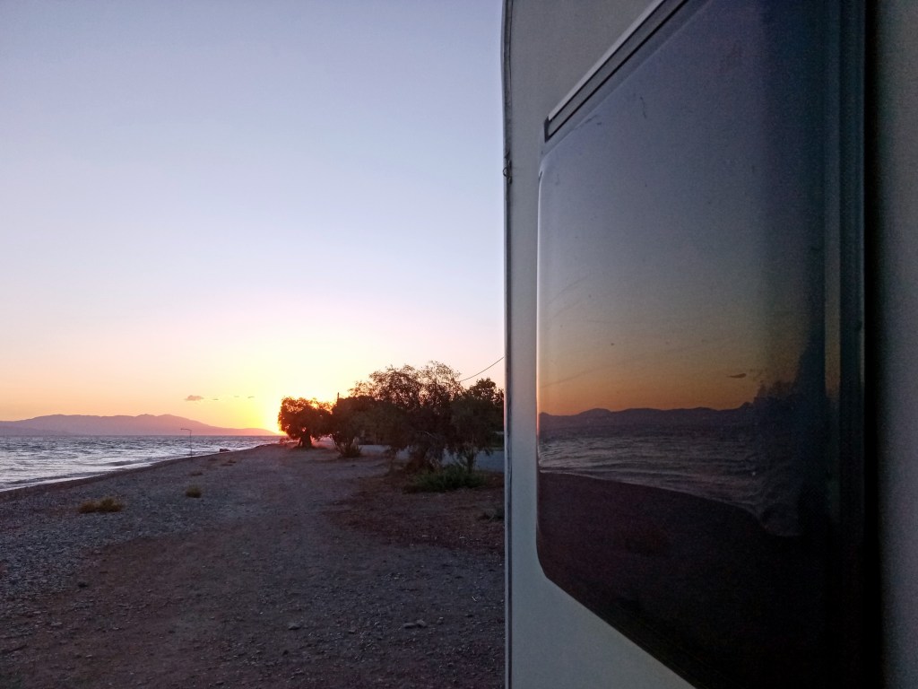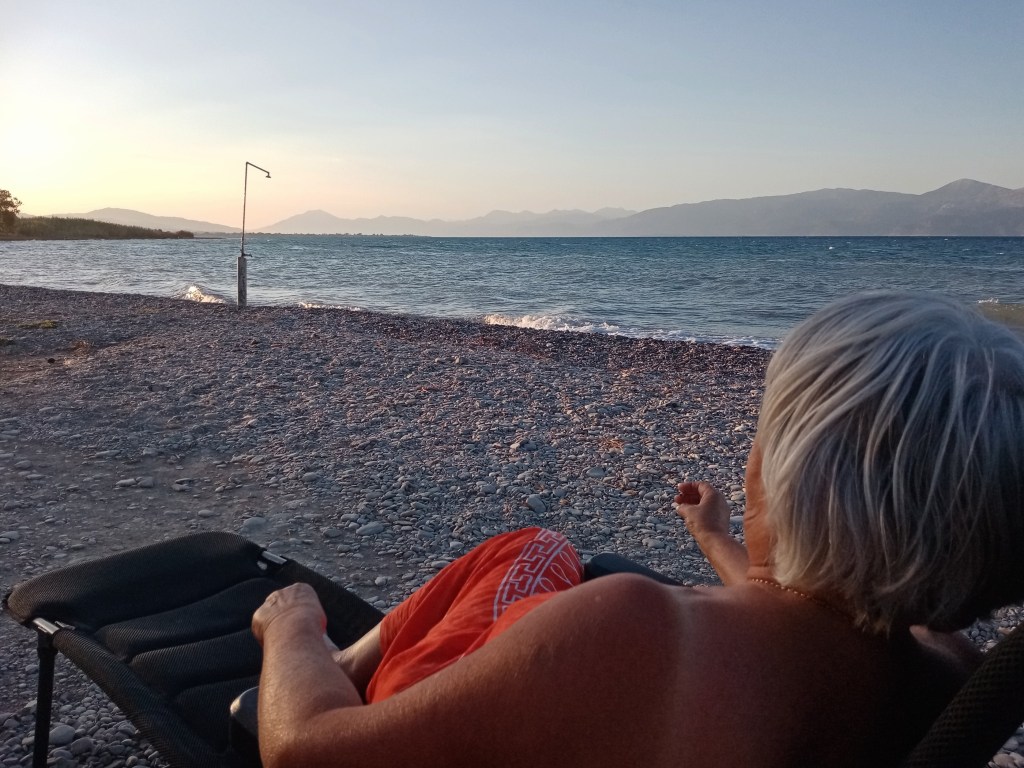 19 SETTEMBRE, VENERDÌ. Per la prima volta in questo viaggio, ieri sera siamo rimasti un po’ all’aperto guardando il cielo stellato. Ma già un’oretta dopo il tramonto c’era freddo, e siamo rientrati presto. A bordo mare, di settembre, fa in fretta a rinfrescare, e prima di dormire abbiamo rimesso in ballo la copertina. Oltre al pezzo di strada rimesso a nuovo, altre cose sono cambiate qui intorno: dove fino al 2022 c’era il canneto, adesso è stato arato, e ieri un arzillo nonno ellenico di prima mattina si è messo ad asportare sassi dal terreno. Dal mio diario: “… era un canneto incolto e ora appare dissodato e pronto a ricevere semina di qualcosa, chissà, pomodori, granturco, patate… così vicino al salmastro. Ma forse è solo un modo come un altro per passare il tempo: c’è chi legge libri e guarda il mare, e chi tira fuori sassi dalla terra. Che calma. Gente che arriva, gente che va, poca, e senza chiasso. Sto immaginando un bilancio di questo viaggio – n° 13 in camper con Mirella, per me n° 27 – alla fine avremo fatto diciassette notti, di cui tre in posti nuovi, quasi tutte in libera tranne due a Kalamàta e una ad Akrata, più quella di domani a Platarià, nella nuova area di sosta che vedemmo nel 2022.” Giornata molto pigra, mattina piccola passeggiata fino al porto e ritorno, pomeriggio assoluto relax. Saluto al mare e all’ultimo tramonto in riva al Golfo di Corinto.