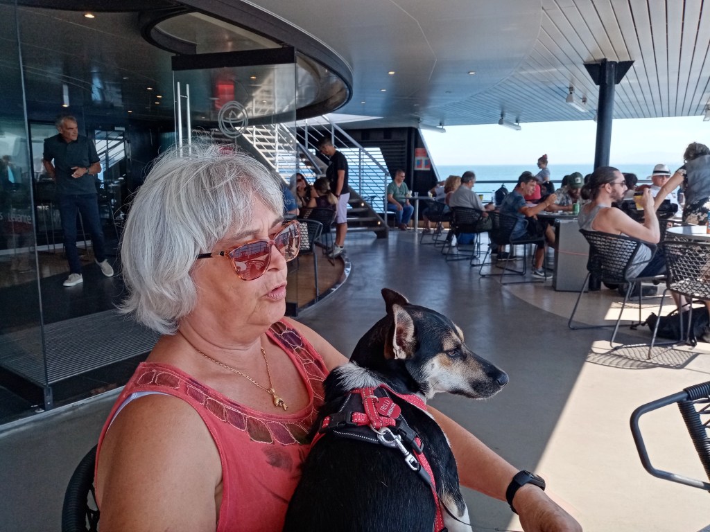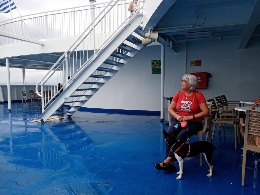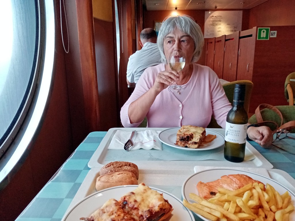 Come da programma, la nave lascia il porto alle 14:30. Pomeriggio pigrissimo in cabina, Trilli all’inizio sembra spaesata ma poi con molta naturalezza prende possesso del letto. Usciamo a fare due passi. Gli spazi sono confortevoli e in ordine, la nave sembra poco affollata sia nei saloni che sul ponte. Ora di cena, festeggiamo la pensione di Mirella con una spettacolare moussakà e un bel brindisi a noi e alla Grecia.