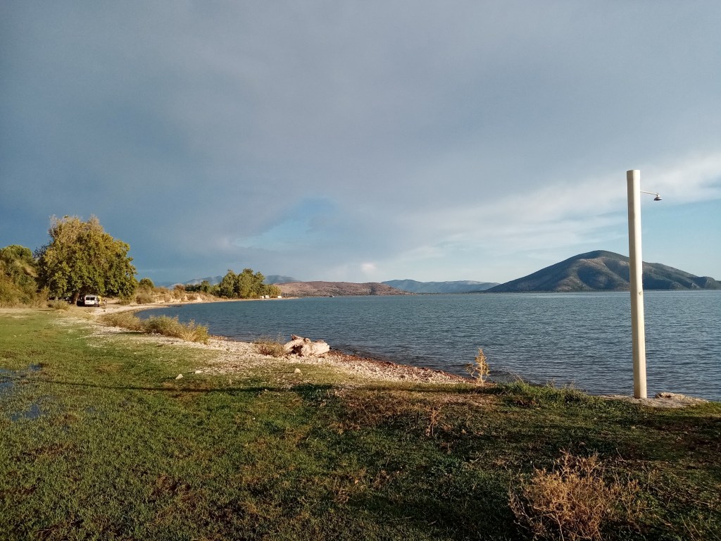 Dopo Goura, che è più o meno all’altitudine del lago ma sull’altro versante della piana, la strada scende a picco verso Mesinò. Qui svoltiamo nuovamente a destra, superiamo un ponte nuovo di zecca, l’altra volta c’era un bailey. Subito dopo vediamo una bellissima fontana nei pressi della Taverna Trikrina. Facciamo il pieno d’acqua e dopo un altro paio di km eccoci di nuovo al bivio verso il lago, che di giorno e arrivando dall’altra parte ha tutto un altro aspetto. Sono circa le dieci, anche stavolta abbiamo fatto un giro di quasi 20 km quando a meno di 5, se avessimo svoltato a destra invece di andare diritto, c’erano sia il negozio sia la fontana: vita da camperista, ma al tempo stesso abbiamo imparato un’altra strada per il ritorno, che ci farà risparmiare una decina di km e soprattutto la strettoia tra Goura e Stenò (che per l’ìappunto significa “stretto”. Sistemato il Dinghy nella stessa identica posizione di due ore fa, ci dedichiamo al dolce far niente per i prossimi due giorni. Unica compagnia, un grosso pastore maremmano che ci ha adottato, e viene a trovarci tutte le sere appena va via il sole e il crepuscolo riempie di riflessi rossastri la superficie del lago.