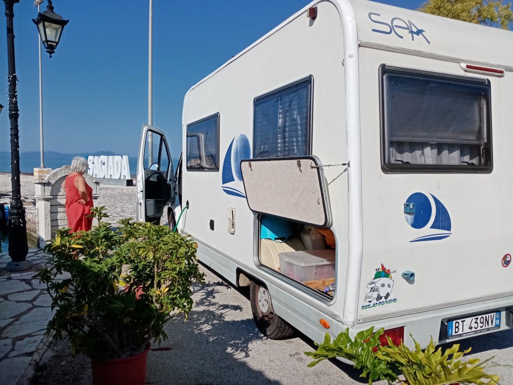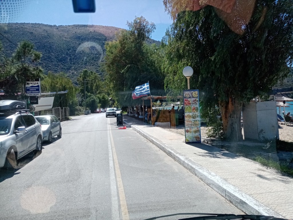 3 SETTEMBRE, MERCOLEDÌ. La nave entra in acque greche, facciamo una buona colazione e poi ancora due passi sul ponte in attesa dell’arrivo in porto, che avviene puntualmente alle 12:30, come da tabella. Sbarco molto veloce, ci districhiamo agilmente dal solito traffico impazzito di Igoumenitsa; assaporiamo il ben noto paesaggio attraversando le distese di agrumeti che coprono quasi per intero quello che era una volta il delta paludoso del fiume Thyamis, antico confine tra la Tesprozìa e la Caonìa (antiche regioni del regno dell’Epiro; la prima è oggi una prefettura ellenica, la seconda fa parte dell’Albania). Brevi soste per il classico acquisto di psomì e spanakotiropita lungo il breve tragitto che ci porta alla nostra bella spiaggia di Sagiada 2, dove arriviamo verso le 14. Anche se conosciamo i recenti – e motivatissimi – inasprimenti del divieto di campeggio, che peraltro con ci ha mai impedito di parcheggiare liberamente, e nonostante la diffusione di qualche notizia (sicuramente falsa) su multe salatissime e addirittura rimozioni forzate se si parcheggia troppo vicino al mare, non abbiamo nessuna esitazione a ritrovare la solita postazione nei pressi della “nostra” doccia. Prima volta a settembre, e francamente non ci aspettavamo che ci fossero altri ospiti, è un luogo dove raramente abbiamo visto arrivare altri camper: stavolta ne contiamo quattro, ma in ogni caso c’è spazio per tutti. Minaccia pioggia, e infatti prima di cena si scarica un furioso temporale, che come è arrivato cessa. Grande relax, profumo di erba bagnata e di salmastro. Nessuno ha voglia di spignattare, cena frugale con tirospanakopita. Ci vuol davvero poco, per essere felici.