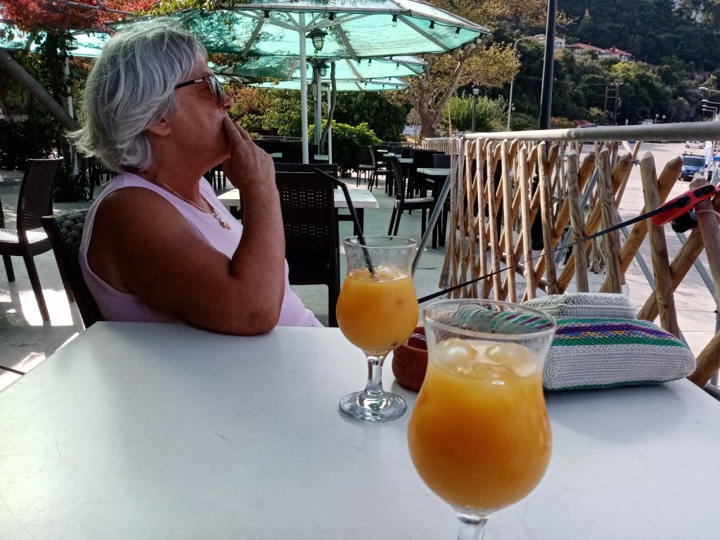 7 SETTEMBRE, DOMENICA. Se ieri, sabato, abbiamo trovato grande affollamento fino alle sei di sera, figuriamoci oggi che è domenica. Ho fatto fatica a prender sonno, c’è stato andirivieni e chiasso fino alle due di notte, e tunza tunza da uno dei ristoranti del lungomare, che smette solo quando vedo dalla finestra il lampeggio blu di un’auto della polizia. Nel silenzio della notte, rotto da uno scalpiccio – una coppia che porta a spasso il cane alle tre di notte – e dal fracasso di un motorino, emergono ricordi di quel viaggio mitico del 2009 e anche di quello in solitaria del 2008, chissà perché non ricordavo strade così strette e faticose come le ho trovate oggi. Prendo finalmente sonno, e mi sveglia il profumo del caffè, mentre Mirella è uscita a guardare il mare, che ha un bel colore ed è molto placido. Intanto, abbiamo deciso che oggi si fa pausa, e che domani, invece di fare ancora strada a ritroso, prenderemo il traghetto per Argostoli, imbarco qui a 1 km. Fatta colazione, vado in cerca di un artopoìo, il centro è qui a due passi. E di un cafè ellenikò skieto, che ancora non ho avuto tempo e modo di gustare.